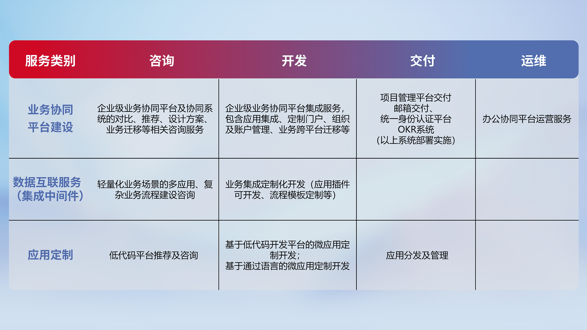 针对钉钉、、、企微、、、、IDaas等平台级产品提供产品的规划、、、、方案、、、交付、、、、定制化开发等服务,,实现如统一协同办公、、智能客户服务、、、混合会议管理、、智能数据查询、、、、等业务场景,,,,实现数字化转型。。。